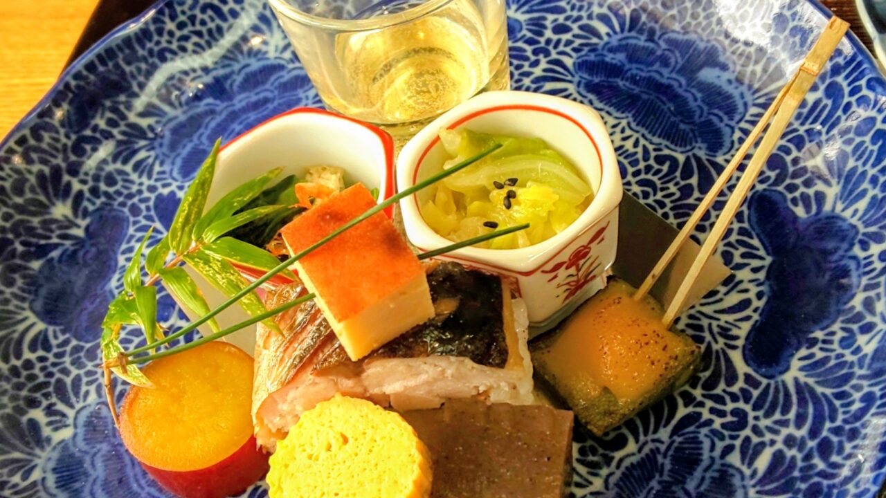 最初に運ばれてきたお皿には、食前酢とさまざまな料理が少しずつ盛り付けられており、